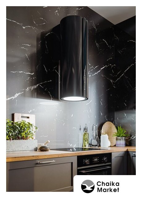 конструкция коробчатая, монтаж островной, ширина 38 см, управление механическое/кнопочное, производительность мотора 1000 м³/ч, цвет черный