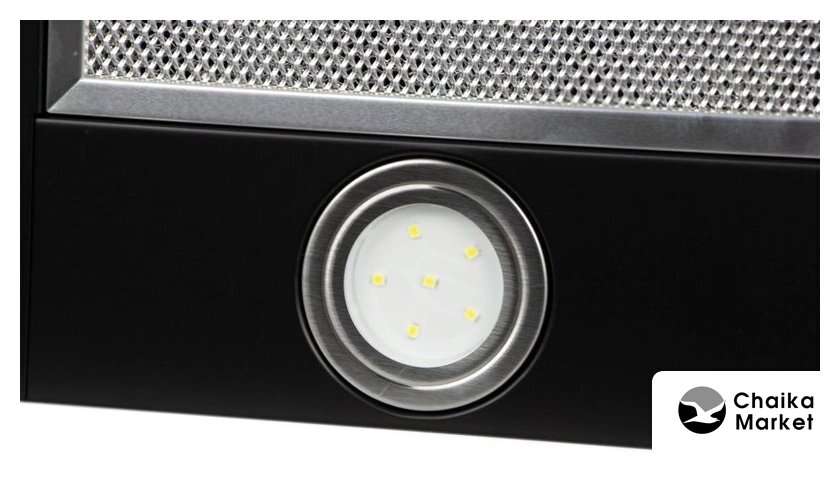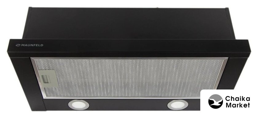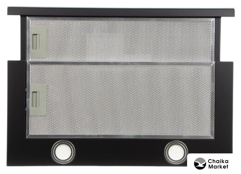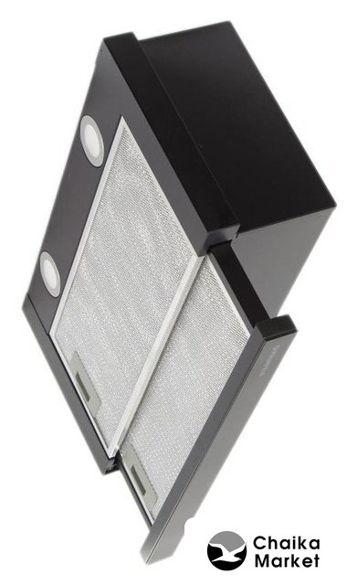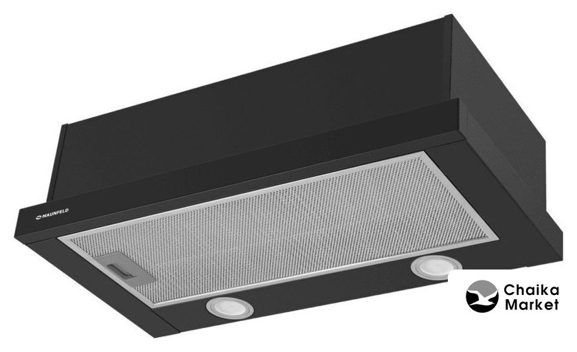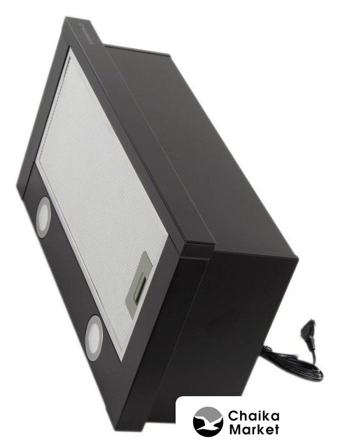 конструкция скрытая, монтаж для встраивания, ширина 52 см, управление механическое/кнопочное, производительность мотора 850 м³/ч, цвет черный