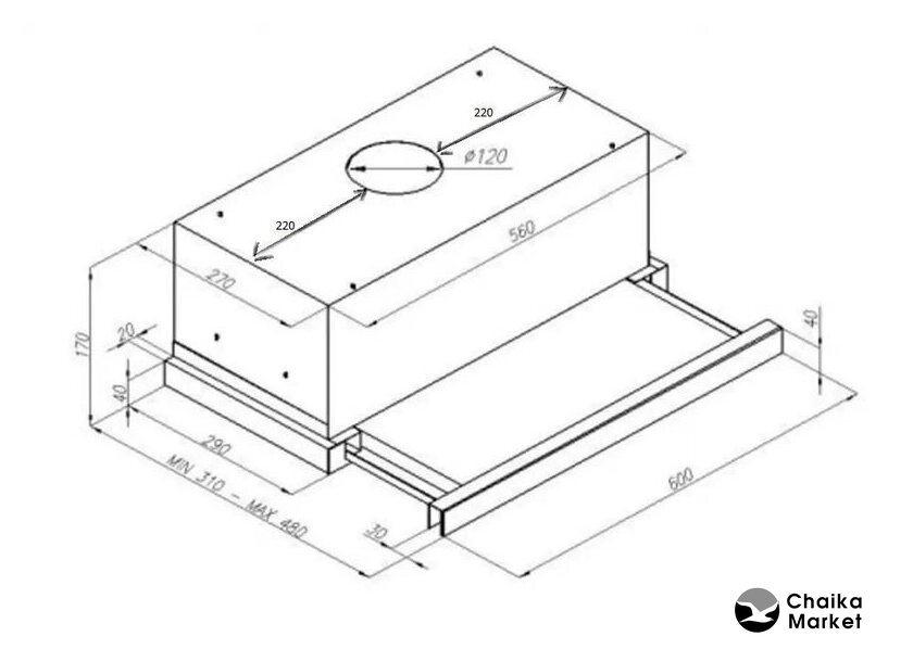 конструкция скрытая, монтаж для встраивания, управление механическое/слайдерное, производительность мотора 600 м³/ч, ширина 59.8 см