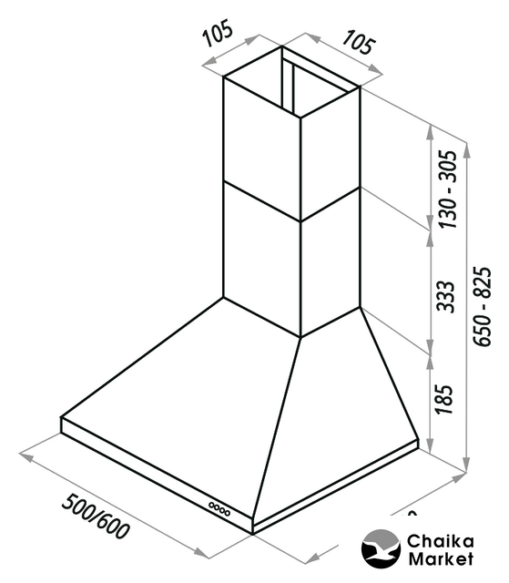 конструкция купольная, монтаж настенный, управление механическое/кнопочное, производительность мотора 500 м³/ч, ширина 50 см