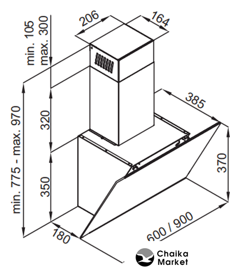 конструкция Т-образная, монтаж настенный, ширина 89.5 см, управление сенсорное, производительность мотора 1150 м³/ч, цвет черный