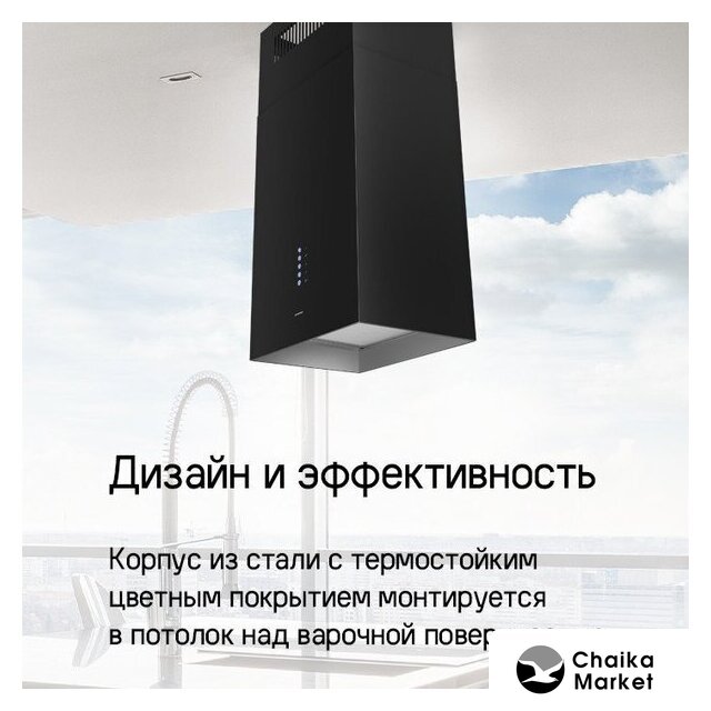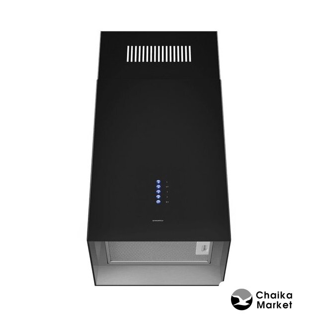 конструкция коробчатая, монтаж островной, ширина 38.3 см, управление механическое/кнопочное, производительность мотора 1050 м³/ч, цвет черный