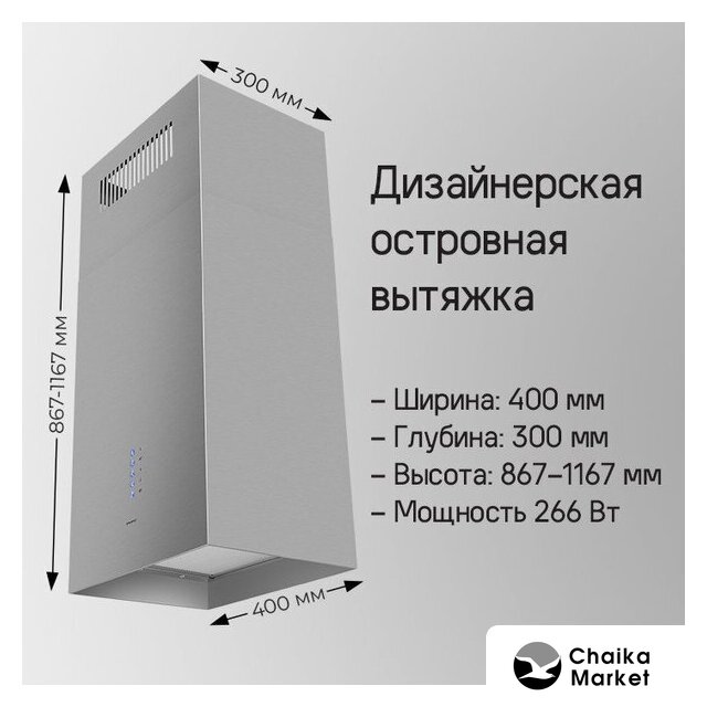 конструкция коробчатая, монтаж настенный, ширина 43 см, управление механическое/кнопочное, производительность мотора 1200 м³/ч, цвет нержавеющая сталь