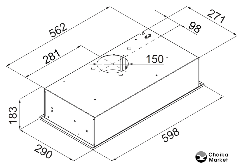 конструкция скрытая, монтаж для встраивания, ширина 59.8 см, управление сенсорное/дистанционное, производительность мотора 1200 м³/ч, цвет белый
