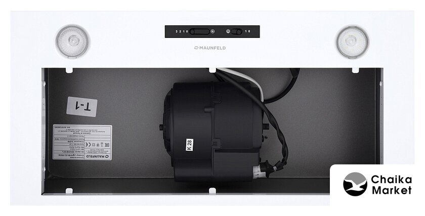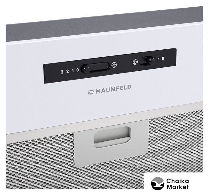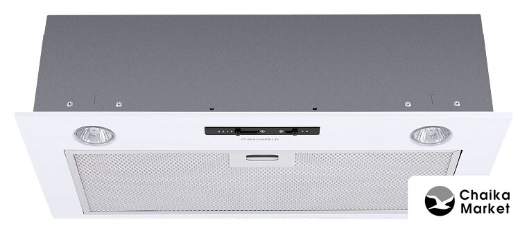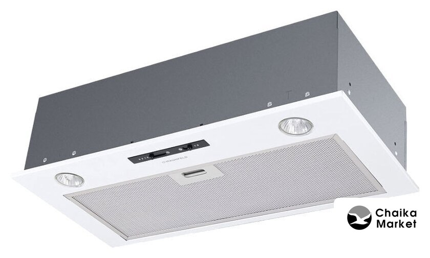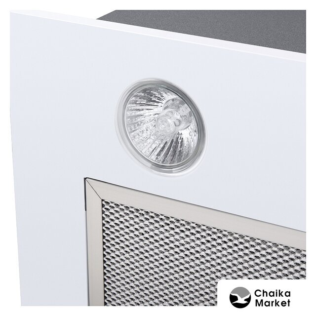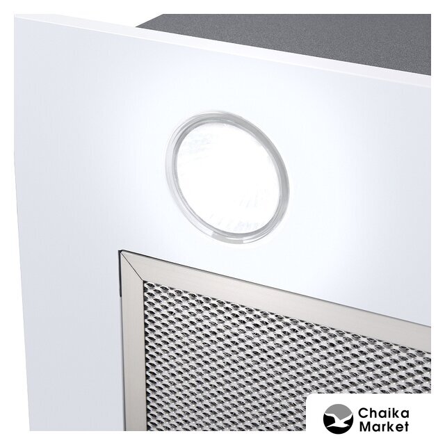 конструкция скрытая, монтаж для встраивания, ширина 49.8 см, управление механическое/кнопочное, производительность мотора 850 м³/ч, цвет белый