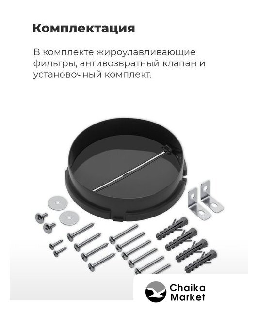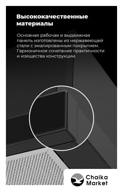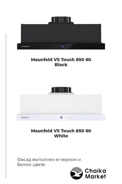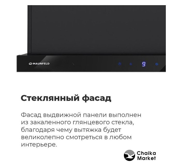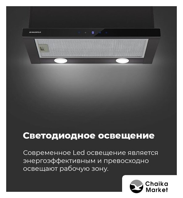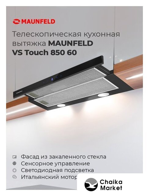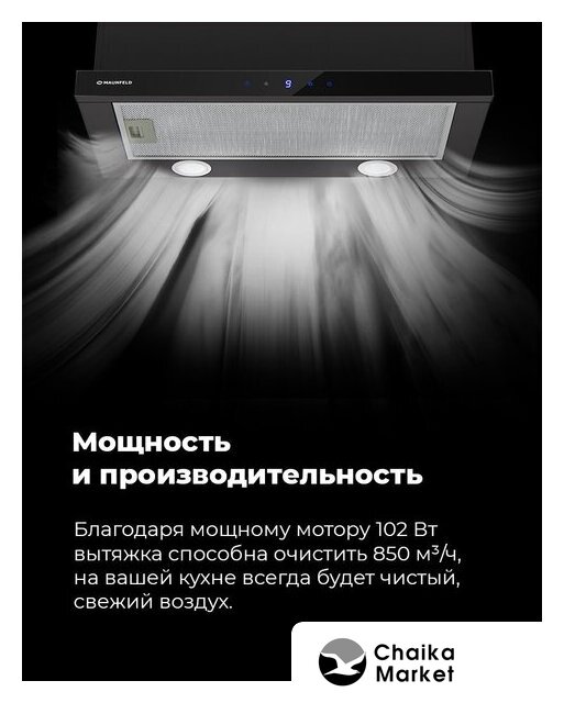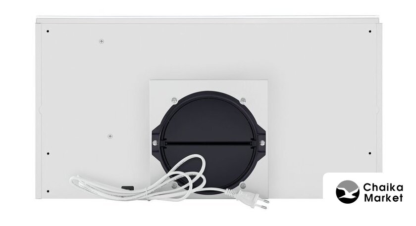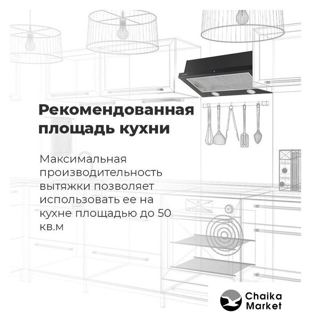конструкция наклонная, монтаж настенный, ширина 59.5 см, управление механическое/кнопочное, производительность мотора 750 м³/ч, цвет черный