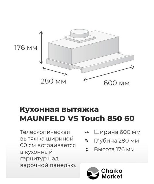 конструкция скрытая, монтаж для встраивания, управление механическое/слайдерное, производительность мотора 1050 м³/ч, ширина 60 см