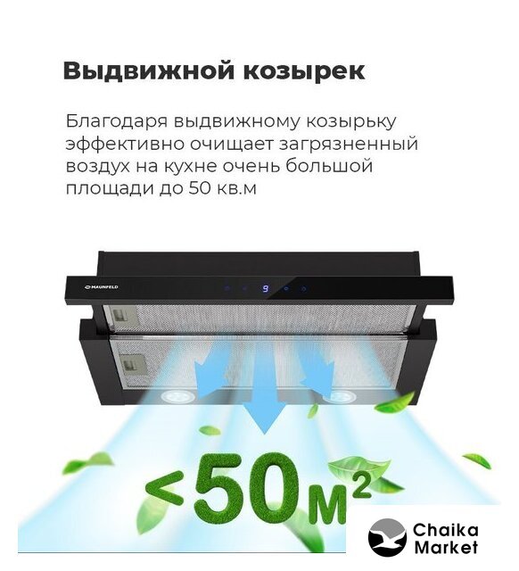 конструкция скрытая, монтаж для встраивания, ширина 49.8 см, управление механическое/слайдерное, производительность мотора 850 м³/ч, цвет черный