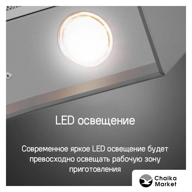 конструкция Т-образная, монтаж настенный, ширина 59.8 см, управление сенсорное, производительность вытяжки 581 м³/ч, цвет нержавеющая сталь/черный