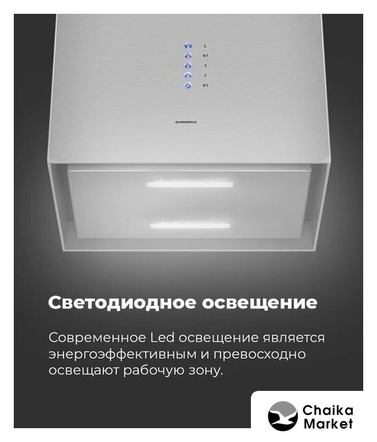 конструкция коробчатая, монтаж островной, ширина 39 см, управление сенсорное, производительность мотора 1000 м³/ч, цвет нержавеющая сталь