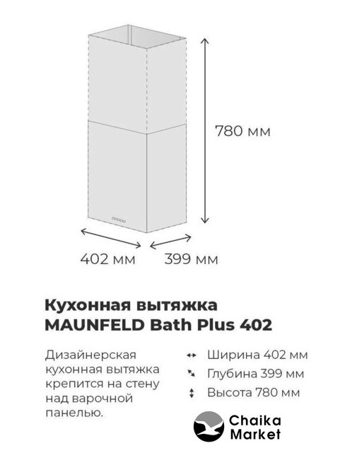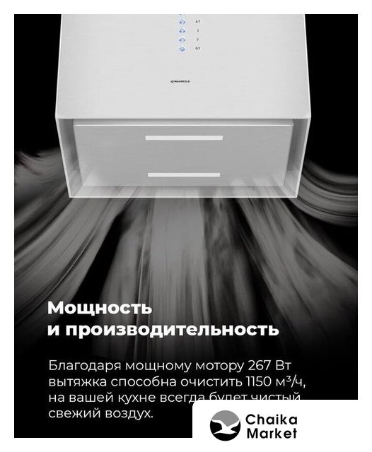 конструкция коробчатая, монтаж настенный, ширина 43 см, управление механическое/кнопочное, производительность мотора 1200 м³/ч, цвет черный