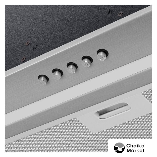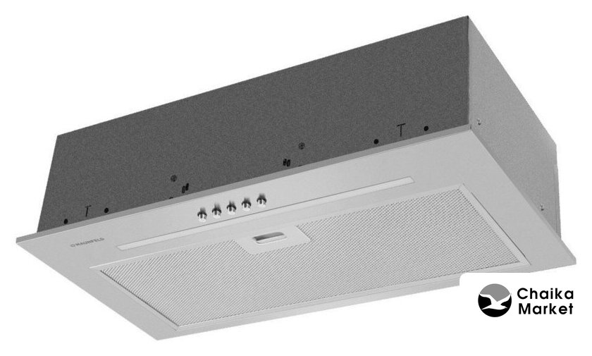 конструкция скрытая, монтаж для встраивания, ширина 59.8 см, управление механическое/кнопочное, производительность мотора 850 м³/ч, цвет белый