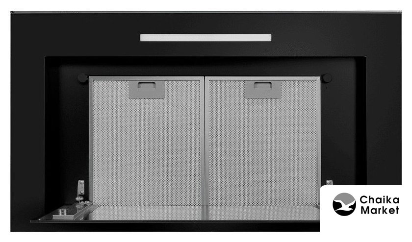 конструкция скрытая, монтаж для встраивания, ширина 59.8 см, управление электронное/кнопочное, производительность мотора 1000 м³/ч, цвет черный
