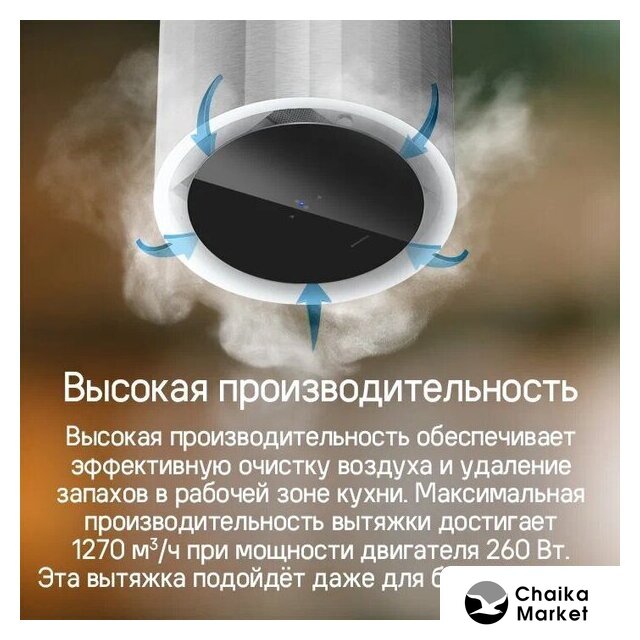конструкция коробчатая, монтаж островной, ширина 38.2 см, управление жестами/дистанционное, производительность мотора 1270 м³/ч, цвет черный