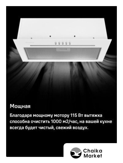 конструкция скрытая, монтаж для встраивания, ширина 59.8 см, управление механическое/кнопочное, производительность мотора 1150 м³/ч, цвет белый