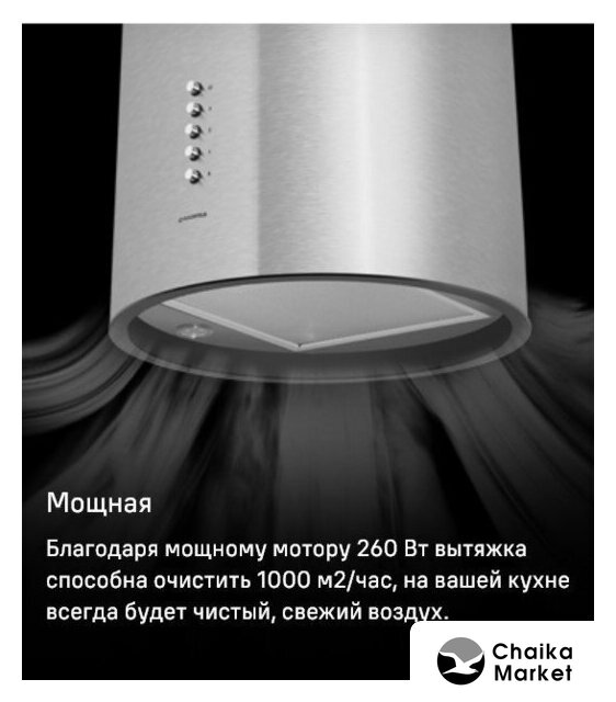 конструкция купольная, монтаж настенный, ширина 89.8 см, управление электронное, производительность мотора 990 м³/ч, цвет нержавеющая сталь