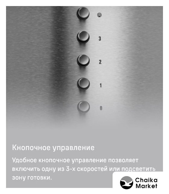 конструкция Т-образная, монтаж настенный, ширина 59.8 см, управление электронное/кнопочное, производительность вытяжки 540 м³/ч, производительность мотора 1200 м³/ч, цвет нержавеющая сталь
