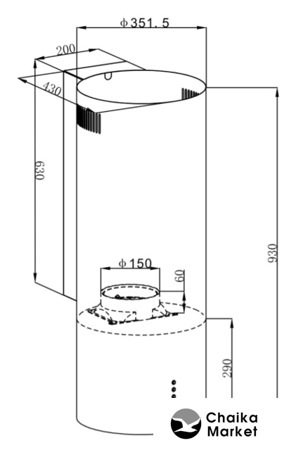 конструкция купольная, монтаж настенный, ширина 59.8 см, управление сенсорное, производительность мотора 800 м³/ч, цвет черный