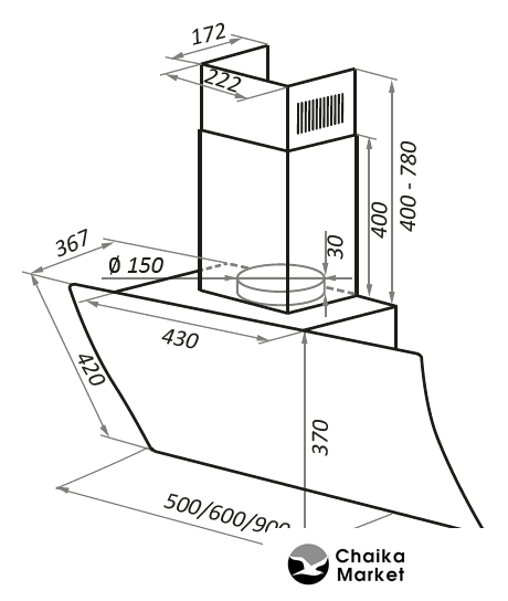 конструкция наклонная, монтаж настенный, ширина 60 см, управление механическое/кнопочное, производительность мотора 850 м³/ч, цвет черный