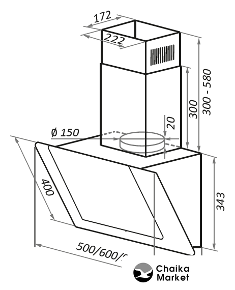 конструкция купольная, монтаж настенный, управление механическое/кнопочное, производительность мотора 500 м³/ч, ширина 60 см