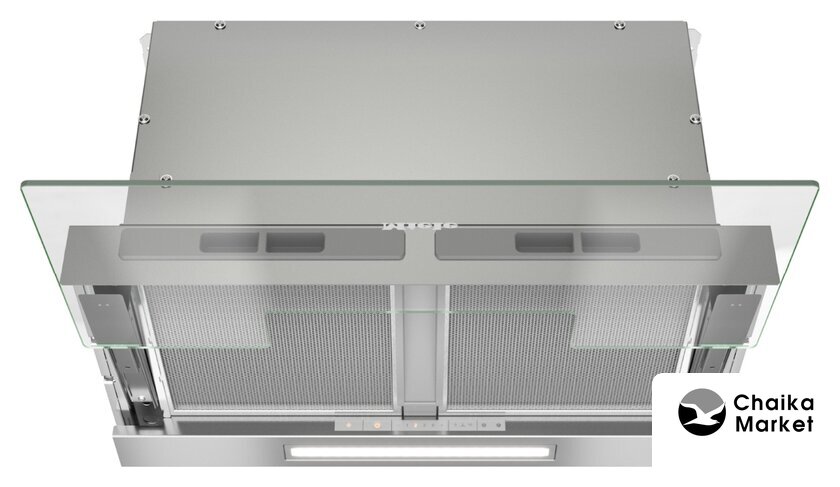 конструкция скрытая, монтаж для встраивания, ширина 59.8 см, управление электронное/кнопочное, производительность вытяжки 570 м³/ч, цвет нержавеющая сталь