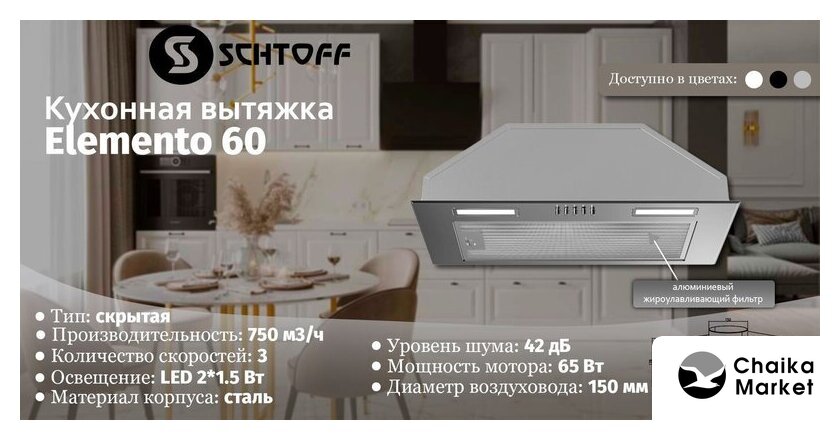 конструкция наклонная, монтаж настенный, ширина 59.6 см, управление механическое/кнопочное, производительность мотора 840 м³/ч, цвет черный