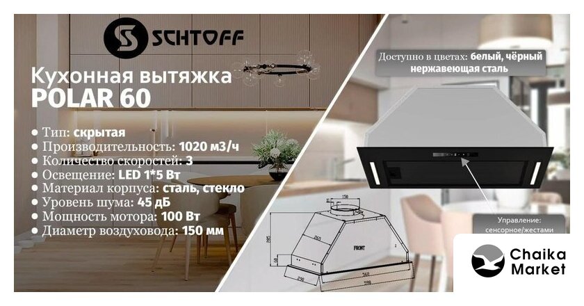 конструкция Т-образная, монтаж настенный, управление сенсорное, производительность мотора 1000 м³/ч, ширина 60 см