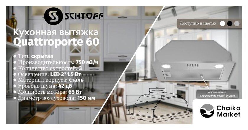 конструкция телескопическая, монтаж для встраивания, ширина 60 см, управление механическое/кнопочное, производительность мотора 520 м³/ч, цвет белый