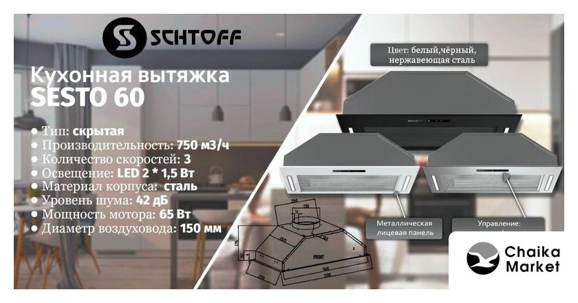 монтаж настенный, управление механическое/кнопочное, производительность мотора 650 м³/ч, ширина 60 см