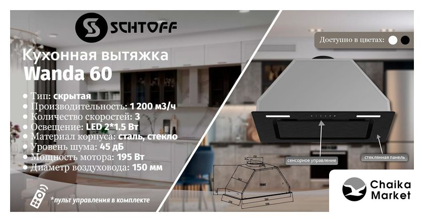 конструкция наклонная, монтаж настенный, ширина 60 см, управление сенсорное, производительность мотора 1060 м³/ч, цвет черный