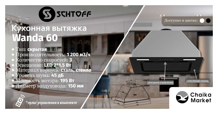 конструкция наклонная, монтаж настенный, ширина 60 см, управление сенсорное, производительность мотора 1000 м³/ч, цвет черный