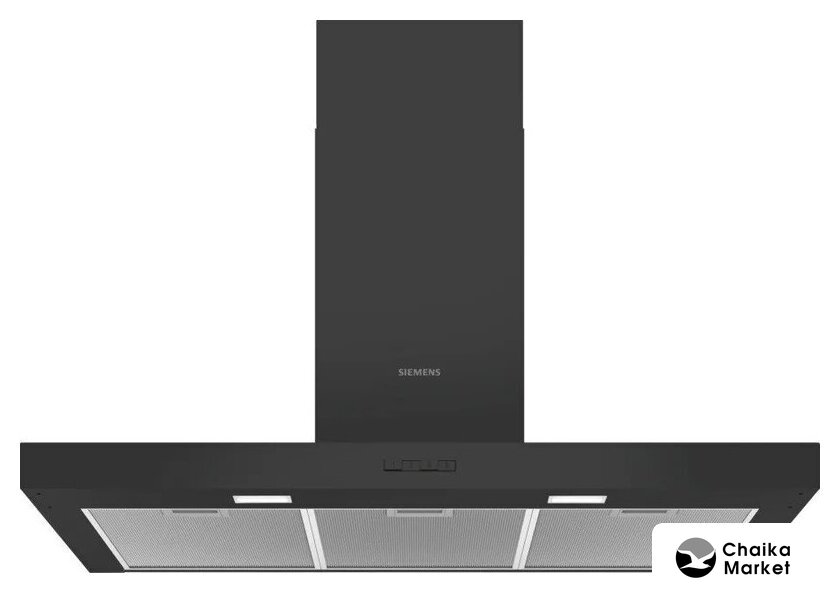 конструкция Т-образная, монтаж настенный, ширина 90 см, управление сенсорное, производительность вытяжки 591 м³/ч, цвет черный