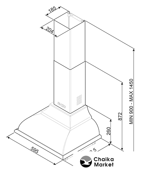 конструкция купольная, монтаж настенный, ширина 89.5 см, управление поворотный переключатель, производительность вытяжки 567 м³/ч, производительность мотора 820 м³/ч, цвет серый