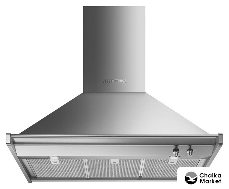 конструкция Т-образная, монтаж настенный, ширина 90 см, управление электронное/кнопочное, производительность вытяжки 620 м³/ч, производительность мотора 1520 м³/ч, цвет нержавеющая сталь