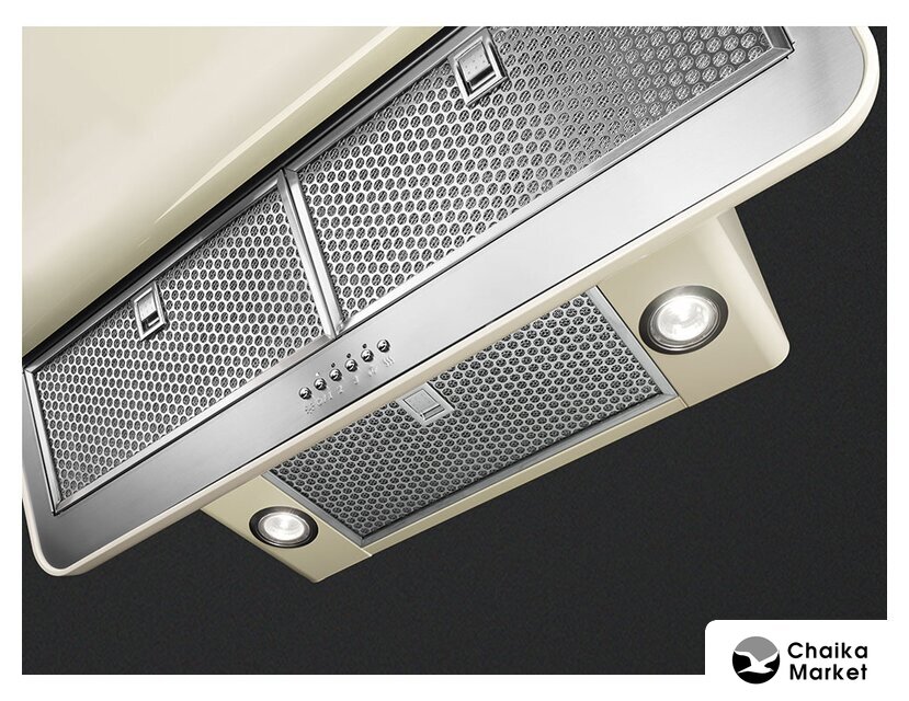 конструкция Т-образная, монтаж островной, ширина 120 см, управление электронное/кнопочное, производительность вытяжки 496 м³/ч, производительность мотора 1200 м³/ч, цвет бежевый/белый