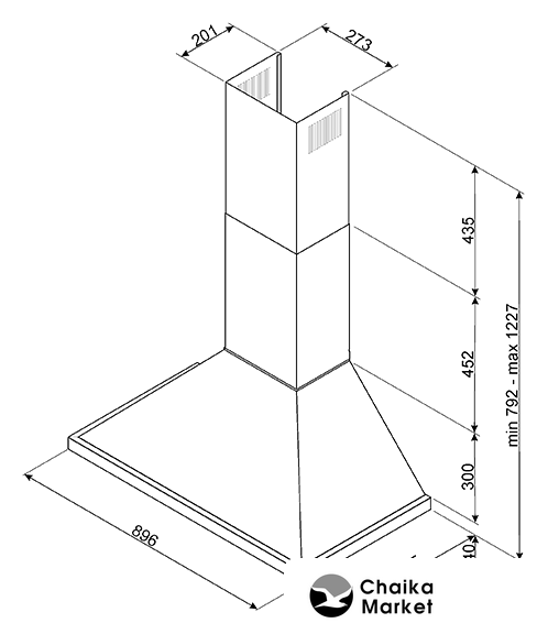 конструкция купольная, монтаж настенный, управление механическое/поворотный переключатель, производительность вытяжки 630 м³/ч, ширина 89.6 см