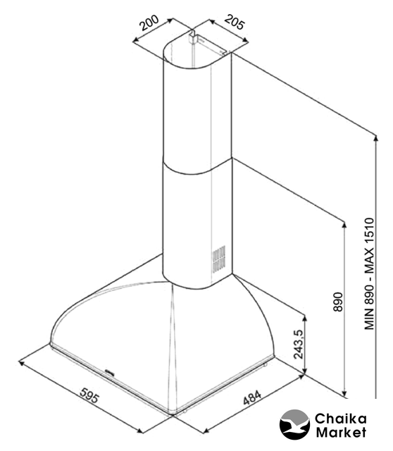 конструкция наклонная, монтаж настенный, ширина 90 см, управление сенсорное, производительность вытяжки 555 м³/ч, цвет черный