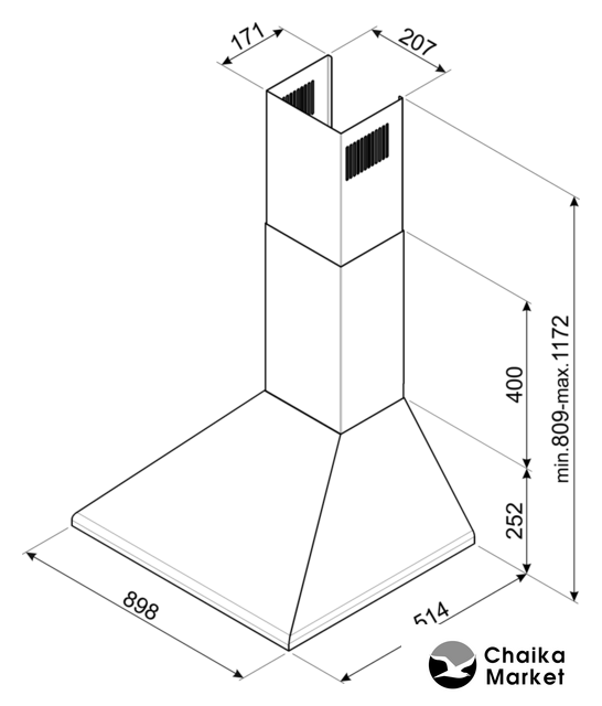 конструкция купольная, монтаж настенный, ширина 69.8 см, управление электронное, производительность вытяжки 600 м³/ч, цвет белый