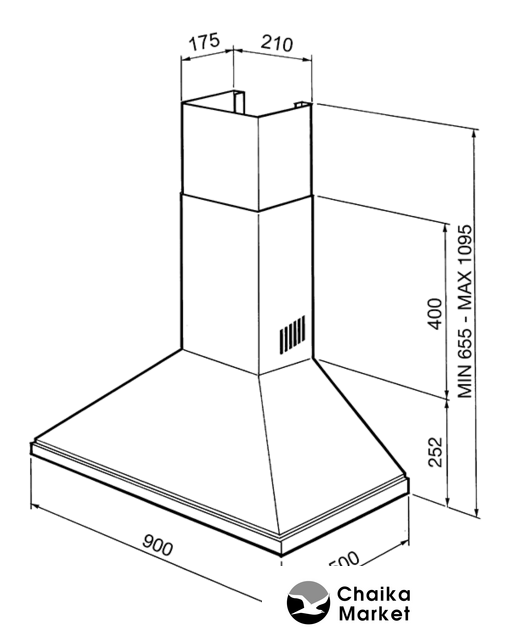 конструкция Т-образная, монтаж настенный, ширина 90 см, управление электронное/кнопочное, производительность вытяжки 451 м³/ч, цвет нержавеющая сталь