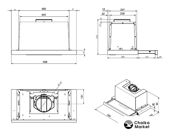 конструкция наклонная, монтаж настенный, ширина 59.6 см, управление сенсорное, производительность вытяжки 575 м³/ч, цвет черный
