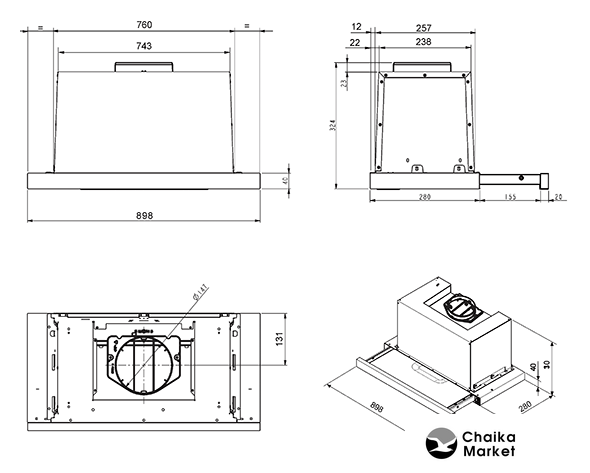 конструкция купольная, монтаж настенный, ширина 69.8 см, управление электронное, производительность вытяжки 600 м³/ч, цвет черный