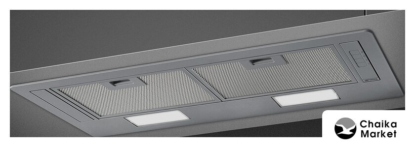 конструкция телескопическая, монтаж для встраивания, ширина 59.8 см, управление механическое/кнопочное, производительность вытяжки 600 м³/ч, цвет серый
