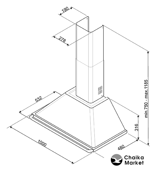 конструкция купольная, монтаж настенный, ширина 100 см, управление поворотный переключатель, производительность вытяжки 606 м³/ч, производительность мотора 820 м³/ч, цвет черный