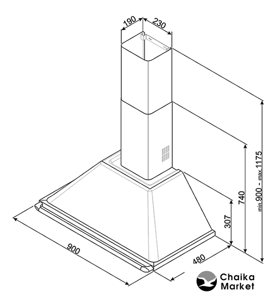 конструкция купольная, монтаж настенный, управление поворотный переключатель, производительность мотора 788 м³/ч, ширина 59.5 см