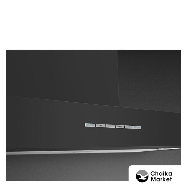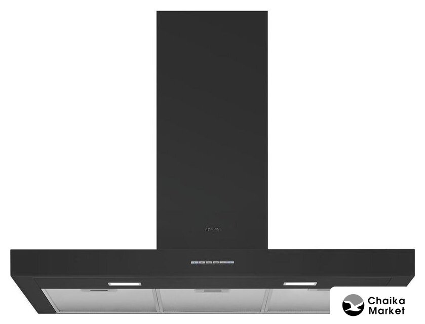 конструкция Т-образная, монтаж настенный, ширина 90 см, управление электронное/кнопочное, производительность вытяжки 480 м³/ч, цвет черный
