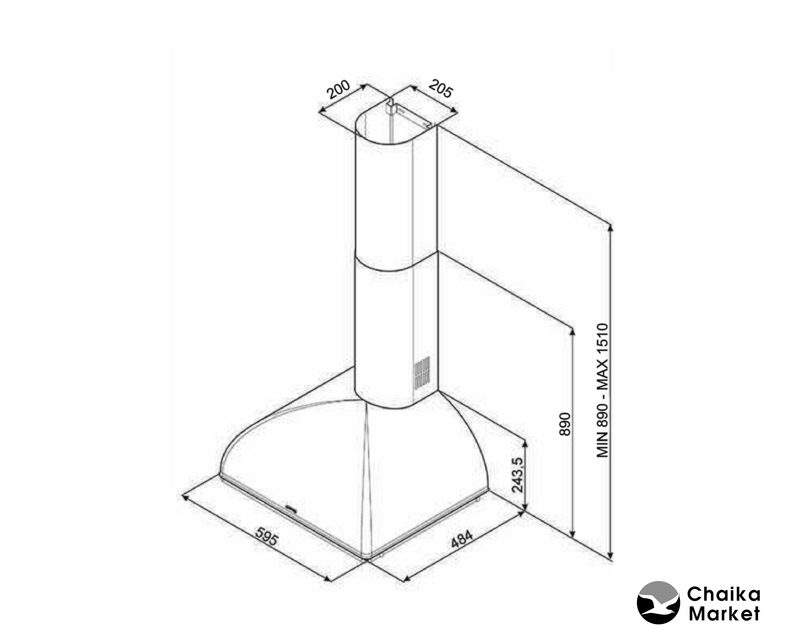 конструкция купольная, монтаж настенный, управление механическое/поворотный переключатель, производительность вытяжки 630 м³/ч, ширина 89.6 см