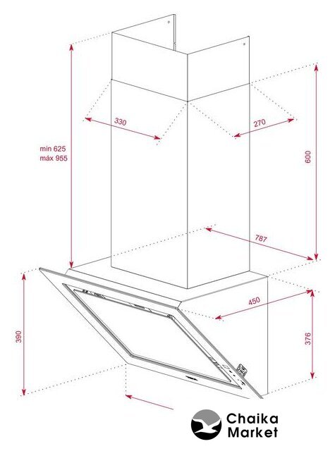 конструкция Т-образная, монтаж настенный, ширина 60 см, управление электронное/кнопочное, производительность вытяжки 451 м³/ч, цвет нержавеющая сталь