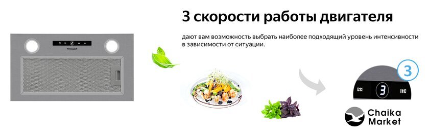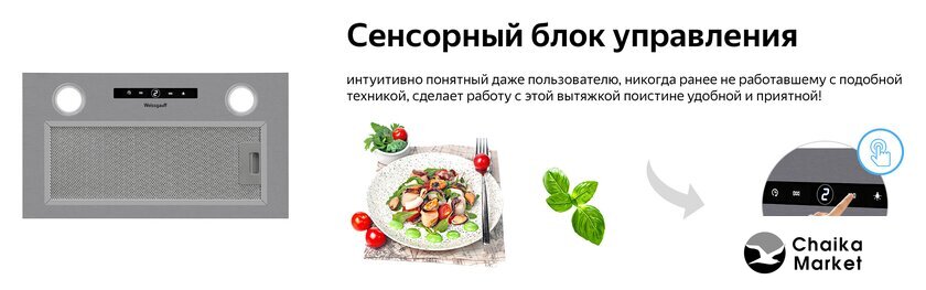 конструкция скрытая, монтаж для встраивания, ширина 58.9 см, управление сенсорное/жестами, производительность мотора 1050 м³/ч, цвет черный