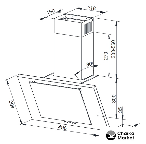 конструкция наклонная, монтаж настенный, ширина 59.5 см, управление механическое/кнопочное, производительность мотора 750 м³/ч, цвет черный