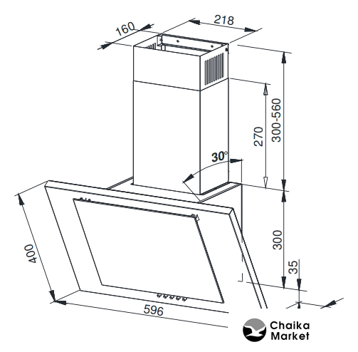 конструкция наклонная, монтаж настенный, ширина 60 см, управление механическое/кнопочное, производительность мотора 700 м³/ч, цвет черный